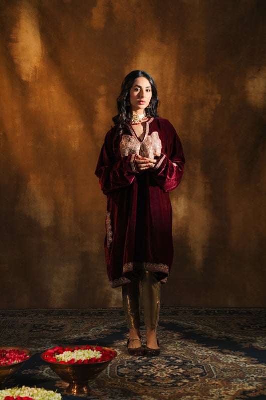 Antique Maroon Silk Velvet Pheran