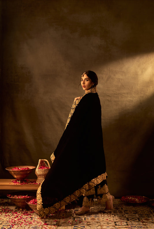 Black Silk Velvet Pheran Gold-Silver Tilla