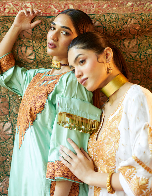 Mint Green Pure Silk Suit Set, Silver Tilla