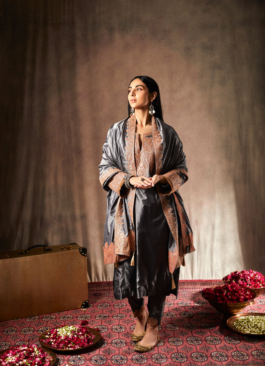 Using the best of Kashmiri silk fabrics, carefully hand picked & chosen. Our Kashmiri Pherans, made with sophisticated golden & silver tilla threads are comfortable and oversized, having a vintage look & feel.