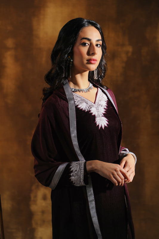 Maroon Silk Velvet Pheran Suit Set