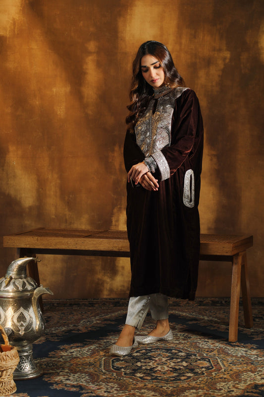 Black Silk Velvet Pheran Gold-Silver Tilla